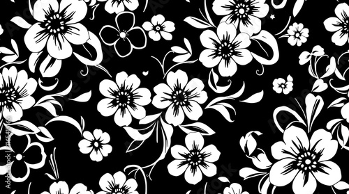 Floral Monochrome: A captivating seamless pattern featuring white blossoms and delicate vines against a black background. This design embodies elegance and sophistication.