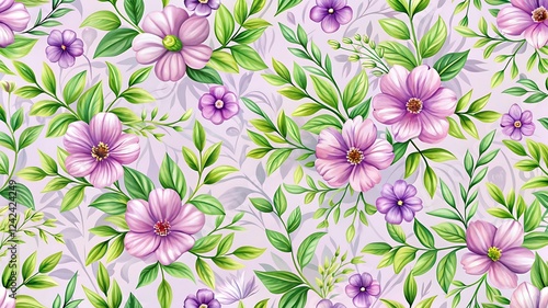 Floral Pattern with Purple Flowers and Green Leaves – Bright and Fresh Design for Spring and Textile Projects