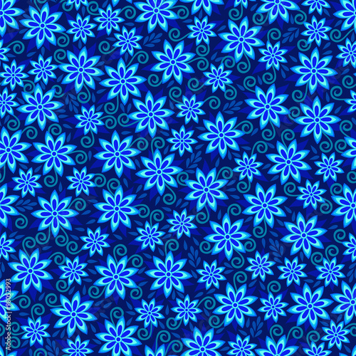 Floral seamless pattern with blue flowers, leaves and swirls.