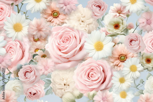 Floral seamless pattern with roses and daisies in soft pastel colors. Generative Ai
