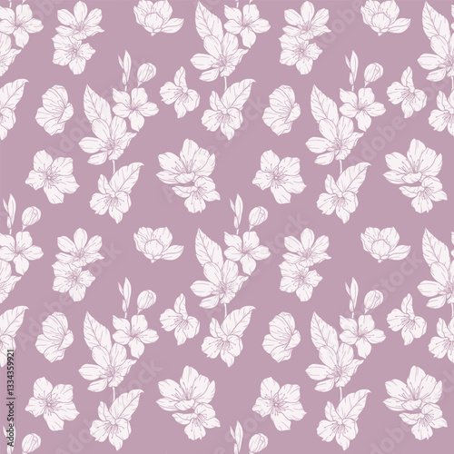 Floral seamless pattern with Sakura. Cherry Blossom background. Eco background. Cherry Blossom and greenery hand drawn line art design. Elegant seamless background minimalist style
