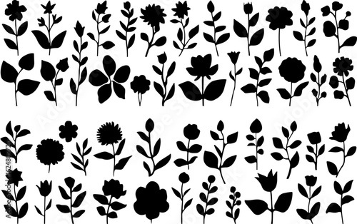 floral, flower, silhouette, botanical, plant, leaf, nature, black-and-white, wildflower, bloom, garden, hand-drawn, floral pattern, stem, monochrome, line art, spring flower, foliage, design element