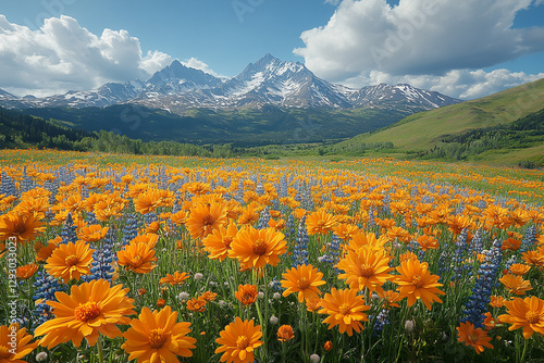 Floral tapestry unfurls beneath majestic peaks on a radiant summer day