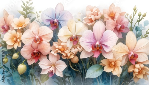 Floral Watercolor Arrangement Featuring Pastel Orchids and Small Flowers Design