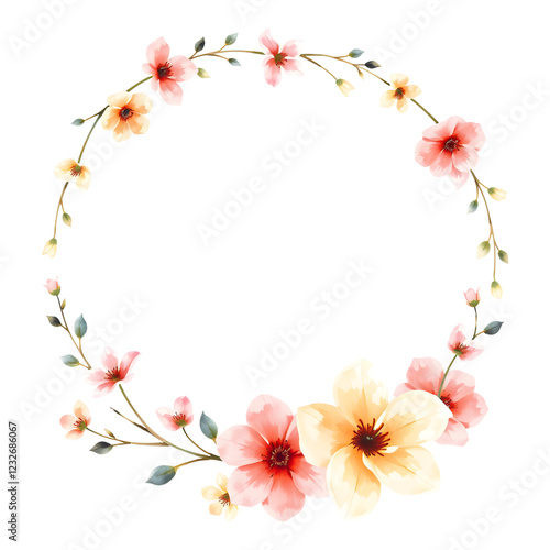 Floral Watercolor Wreath: A delicate watercolor wreath of pastel pink and yellow flowers, arranged in a circular frame, perfect for adding a touch of elegance to your designs.
