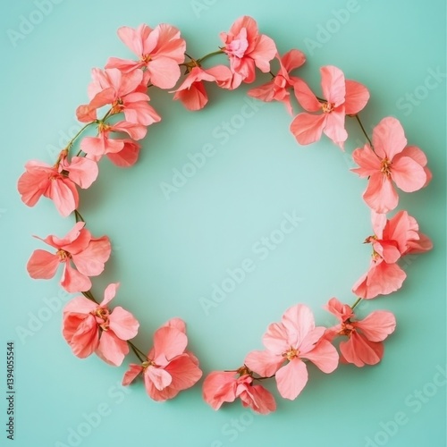 flower, floral, chaplet, coral, blossom, bloom, circle, frame, arrangement, decorative, decoration, spring, summer, light, pastel, blue, background, design, nature, plant, botanical, freshness, romantic, season, valentine, invitation, card, template, border, elegant, feminine, copy space, space, bright, beauty