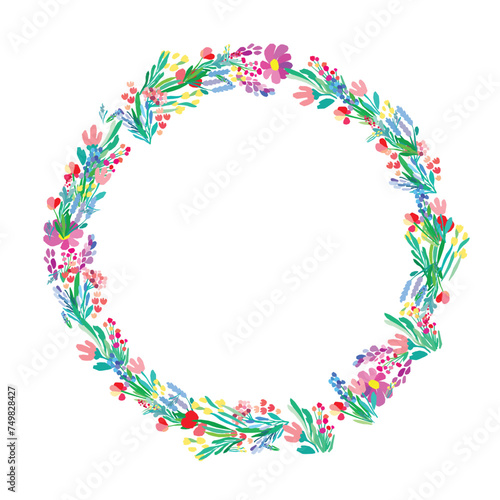 Floral wreath on white background. Bright colorful spring flowers. Vector floral frame template.