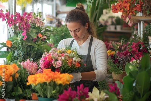 Florist Creating a Beautiful Bouquet Surrounded by Colorful Flowers and Plants
