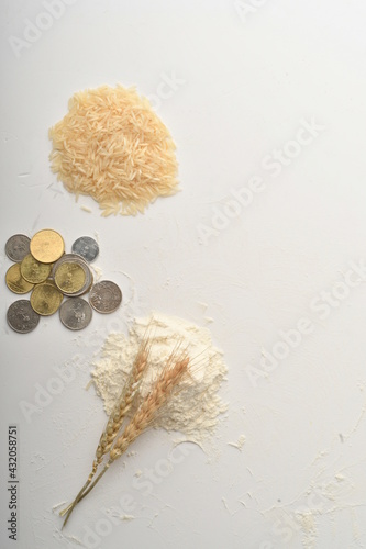 Flour, wheat, rice, raisins and coins on a white background