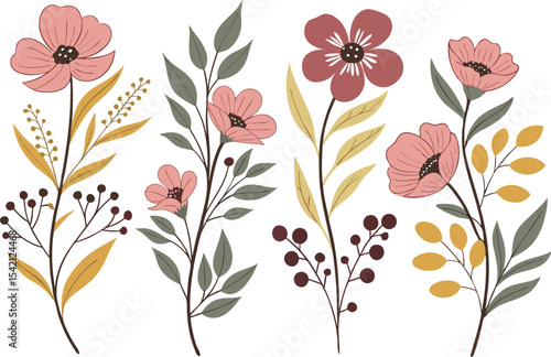 Flower and foliage botanical illustrations on white background, flowers arrangement