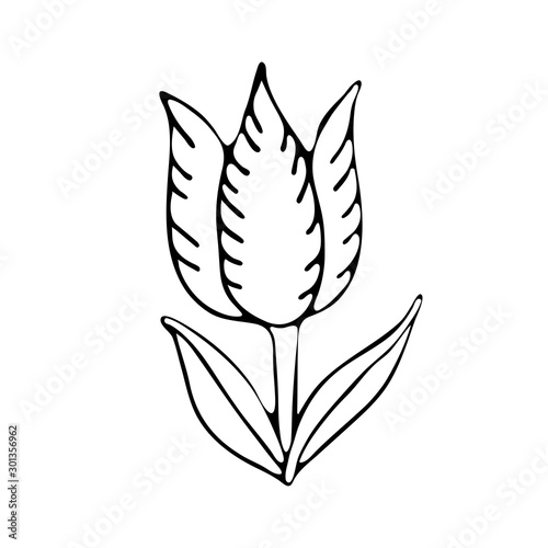 Flower art line. Tulip in vector isolated on white background. Spring flowers drawn in black and white line. Icon or symbol of spring and flowers.Continuous line drawing. Doodle outline.
