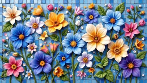 Flower Mosaic Design a mosaic style artwork featuring various flowers and shades of blue, creating a harmonious visual tapestry.