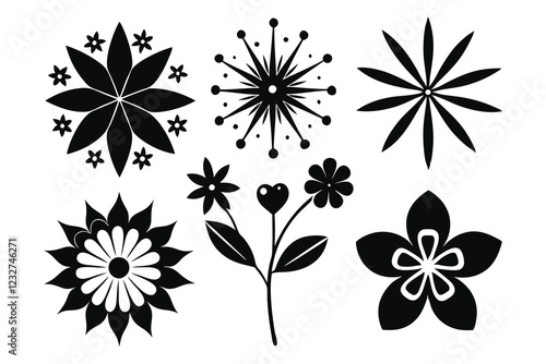 Flower Silhouette Vector Set with Six Unique Styles on White Background