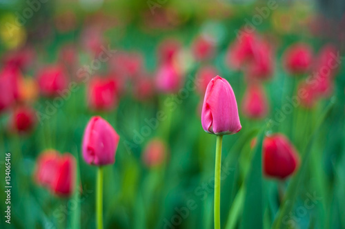 Flower tulips background. Beautiful view of red tulips in the garden.