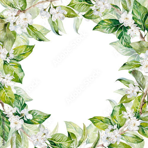 tree branch, in bloom, leaf, watercolor, illustration, frame, chaplet, green, flower, square, fruit, apple, twig, art, tree, peach, apricot, pear, cherry, nourishment, greeting, paint, organic, hand-drawn, realistic, bright, template, painting, botany, white, herb, floral, invitation, fresh, isolated, summer, spring, botanical, design, drawing, decoration, natural, nature, foliage, greenery, background, vintage, plant, garden