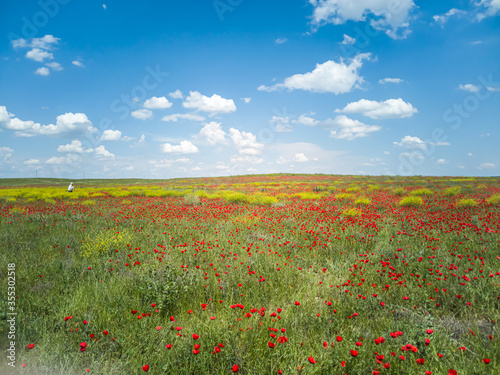 flower, background, floral, summer, nature, spring, ala, astana, beautiful, beauty, bloom, blooming, blossom, bright, colours, countryside, environment, field, gentle, grass, green, kazakhstan, landscape, meadow, natural, plant, poppy, poppy, red, scenery, season, sky, steppe, tau, wild