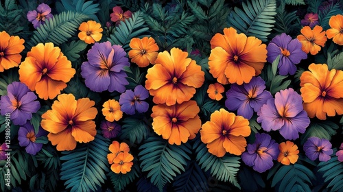 flower, foliage, floral, arrangement, bloom, blossom, botanical, garden, plant, leaf, vibrant, nature, flora, decorative, beautiful, flower petals, orange, purple, dark, moody, background, tropics, exotic, lush, springtime, summer, colourful, pattern, texture, illustration, art, design, wallpaper, freshness, growth, natural, delicate, artistic, ornamental, blossom, tropical, beauty, flourishing