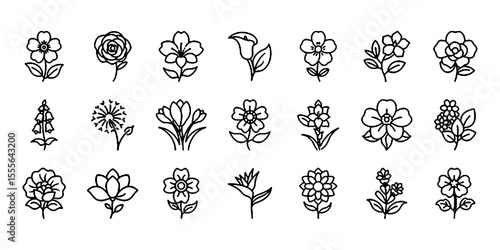 flower, magnolia, blowball, crocus, calla, lily, icon, line, vector, set, outline, stroke, pictogram, illustration, thin, linear, symbol, style, azalea, anemone, bird, paradise, buttercup, camelia, dahlia, foxglove, geranium, gladiola, lilac, oleander, primrose, ranunculus, snapdragon, violet, begonia, plant, blooming, decorative, botanical, organic, nature, bouquet, garden, seasonal, minimal, floral, leaf, decor, ornament