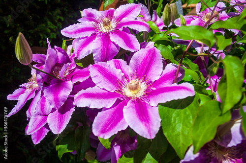 Flowers of perennial clematis vines in the garden. Beautiful clematis flowers near the house.