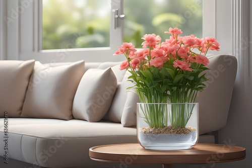 flowers on the windowsill , sofa and glass window with a flowerpot in the room -Generative Ai