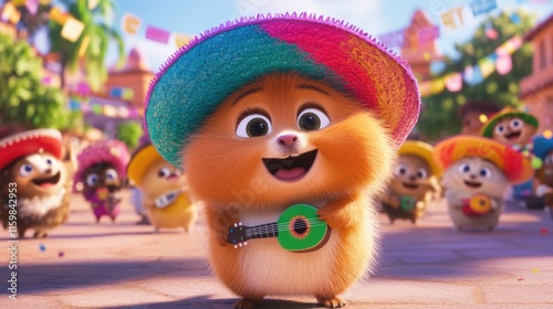 sombrero, hamster, cartoon, ukulele, fluffy, cute, colourful, animation, joyful, parade, vibrant, festival, music, fun, friends, party, cheerful, adorable, lively, celebration, fifth, happy, sunny, charming, gathering, character, energetic, cartoonish, musical, festive, scene, crowd, mexican, high-coloured, mexico, mayo, 5, furry, dancing, animal, day, tropical, may