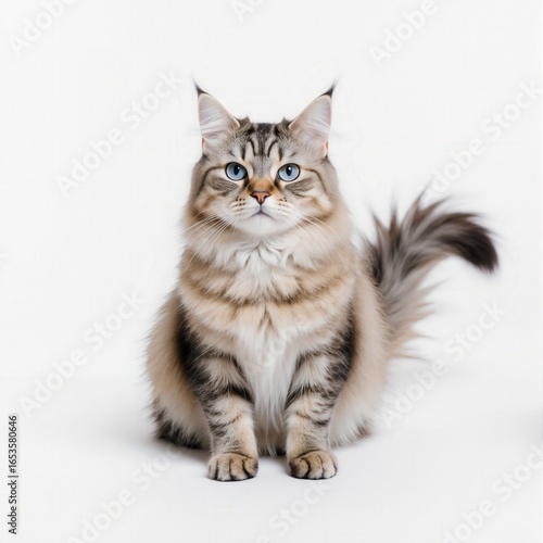 cat, maine coon, fluffy, white background, sitting, blue eye, long hair, pet, mammal, whisker, tail, soft, cute, animal portrait