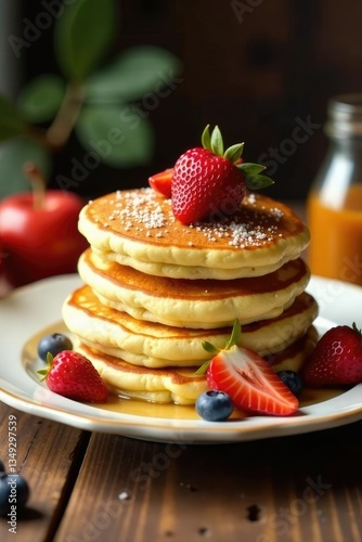 Fluffy pancakes stacked high on a wooden table, kitchen table, breakfast, plate