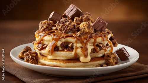 Fluffy pancakes topped with caramel sauce, chocolate chunks, and crunchy candied nuts on a white plate