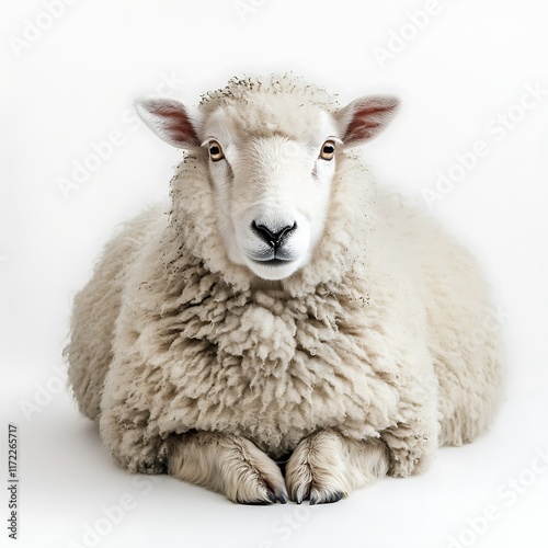 Fluffy sheep lying, white background, farm animal portrait, agriculture.
