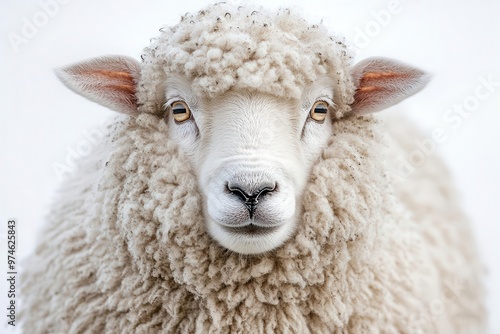 fluffy sheep with expressive face isolated on pure white background highkey studio lighting accentuating wooly texture