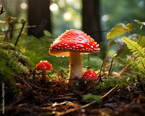 Fly agaric mushrooms in the forest