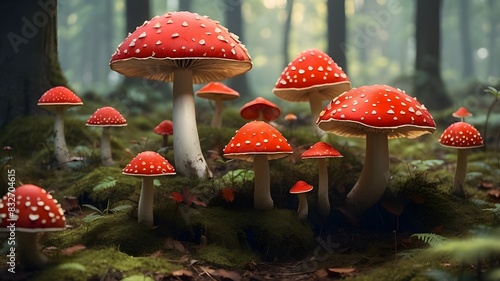 Fly agaric mushrooms populate a clearing in the woods, bringing to mind the fantastical mushrooms from the "Alice in Wonderland" stories. Generative ...