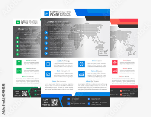 Flyer layout vector illustration. Corporate advertising design. Business presentation creative concept. A4 flyer (leaflet) layout in blue, red, green colors. Ready to use, edit and print.