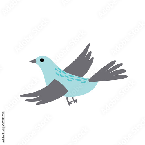 Flying bird. Blue bird, grey wings. Flight. Flat, cartoon, isolated