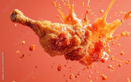 Flying hot fried chicken with sauce splashes on bright coral background