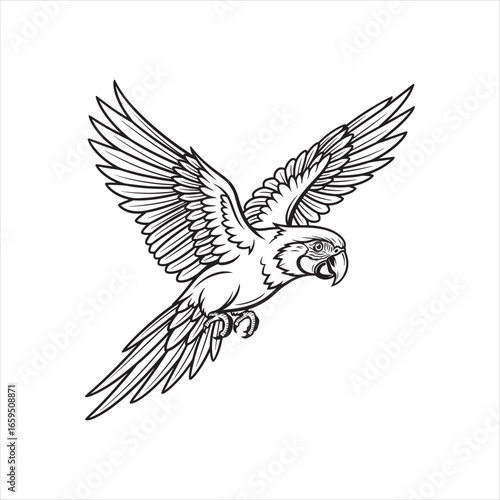 "Flying Parrot – Dynamic Black and White Bird Illustration"