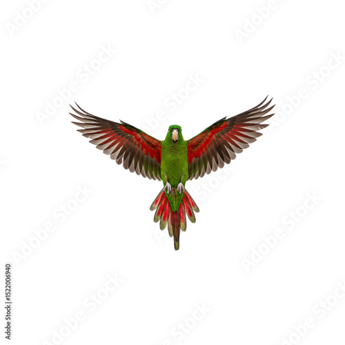 Flying parrot with spread wings, showcasing vivid feathers and movement.