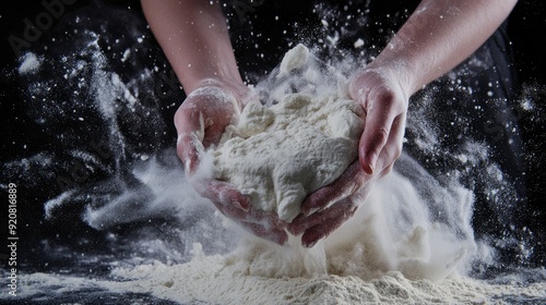 flying pizza dough with flour scattering in a freeze motion of a cloud of flour midair on black. Cook hands kneading dough. copy space with generative ai