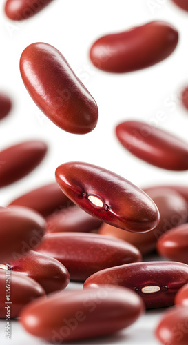 Flying red kidney beans with a pile on a white background