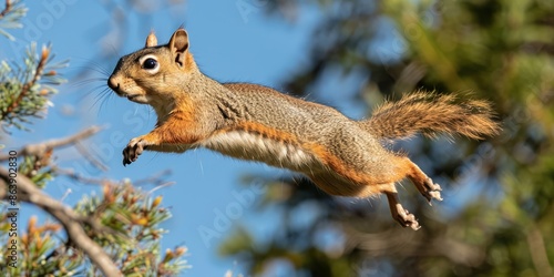squirrel, flying, soaring, mid-air, tree, branch, nature, wildlife, forest, jumping, leaping, clear, blue, sky, green, leaf, outdoors, daytime, motion, action, animal, bush, wild, fur, rodent, natural, skyward, freedom, adventure, energy, swift, speed, movement, graceful, dynamic, vigorous, leap, spring, scene, moment, capture, lively, organic, high-coloured, active, sharp, sharpened, photo