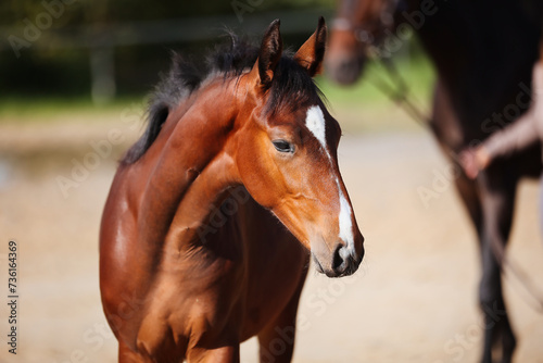 Foal horse brown in the sunshine on the riding arena.