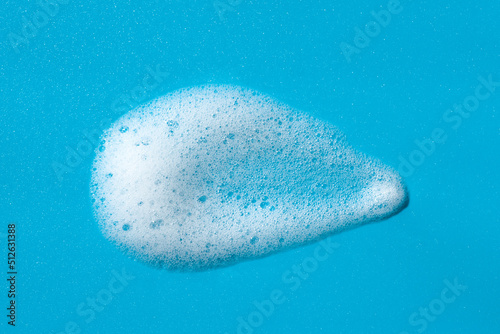 Foam swatch on a blue background. Soapy liquid texture with bubbles. Natural sunshine and shadows. Skin care cleansing cosmetic in top view.