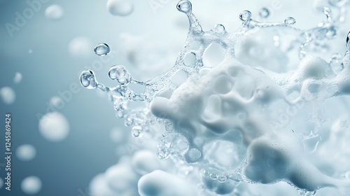 Foamy splash of water with bubbles on a light blue background. Dynamic and refreshing for cleaning or freshness themes