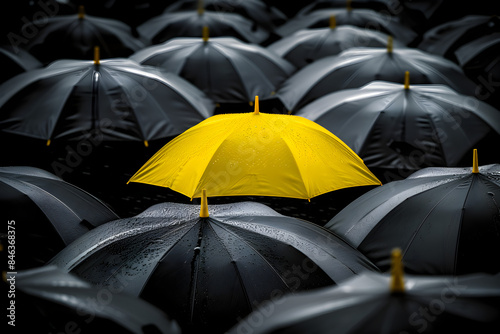 Focus on a yellow umbrella alone among a crowd of black umbrellas on a rainy day, concept of identity and difference, of being unique among others.