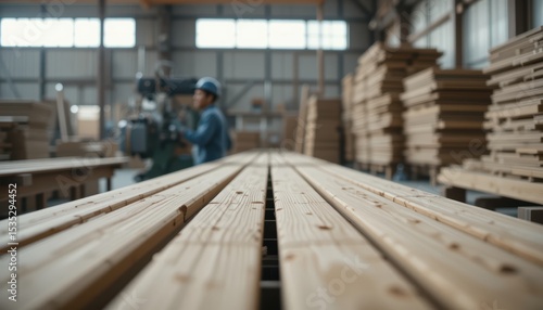Focus on Plank Wood in Workshop with Worker Operating Machinery in Background, Industrial Setting