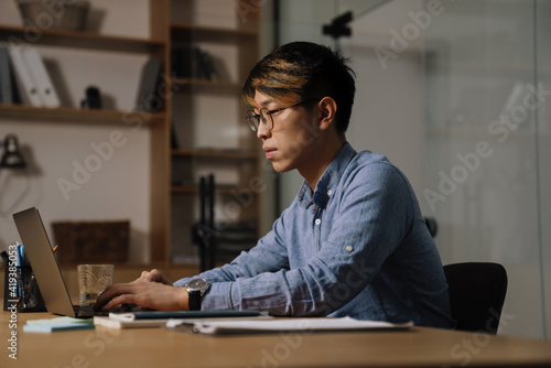 Focused asian guy working with laptop while sitting at table in office