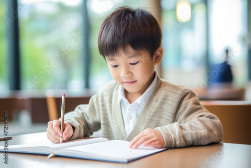 Focused Asian student, A young boy diligently writing in a school textbook, immersed in learning.