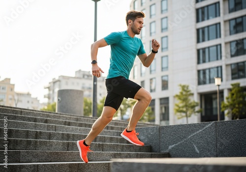 running, runner, athlete, fitness, exercise, physical exercise, stair, step, urban, city, building, outdoors, health, healthy, lifestyle, active, sporty, man, male, jog, jogging, training, teal, orange, shoe, sneaker, footwear, wearable, technology, modern, architecture, sunlight, daylight, wellness, well-being, motivation, determination, effort, achievement, progress, climb, ascending, upward, movement, motion, energy