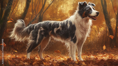 dog, border collie, forest, autumn, leaf, standing, pet, animal, nature, outdoors, furry, playful, loyal, canino, breed, companion, wildlife, scenery, vibrant, foliage, bark, tail, happy, alert, intelligent, training, agility, exercise, running, friendly, beautiful, coat, fur, landscape, sunlight, tree, environment, seasonal, park, grass, earth, companionship, wild, adventure, exploration