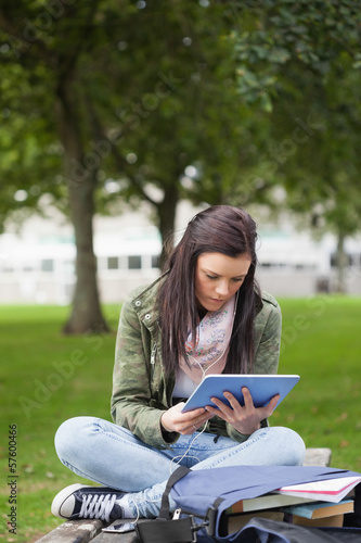 young adult, woman, female, caucasian, outdoors, campus, park, parkland, lawn, green, grass, tree, college, university, bench, book bag, notepad, notebook, tablet, leisure, lifestyle, free time, time off, student, casual attire, attractive, pretty, sitting, scrolling, touching